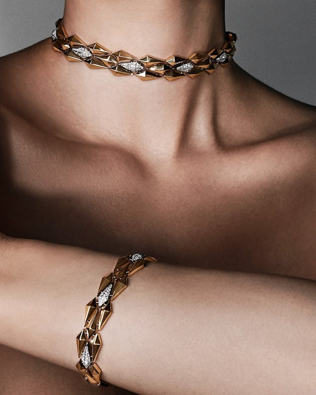 Die Tapers III Collier wurde mit präziser Handwerkskunst und Liebe zum Detail aus feinsten Materialien wie 18-karätigem Weiß- und Roségold gefertigt. Die Halskette spielt kunstvoll mit geometrischen Formen und zeigt konvexe Dreieck-Formen, die auf subtile Weise miteinander verbunden sind, so dass es scheint, als würden sie schweben. Einige von ihnen sind mit Diamanten im Brillantschliff besetzt, was dem Collier einen zusätzlichen luxuriösen und raffinierten Touch verleiht. Die Tapers III Halskette ist Teil des "Tapers Set" und kann mit dem Tapers II Armband kombiniert werden.