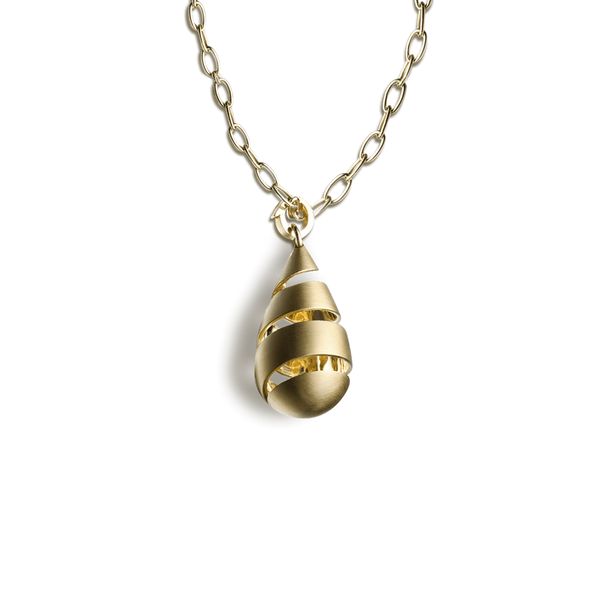 This pendant is handmade in 18 karat gold. A metal sheet is curved around the shape of a tear. The outer surface is sandblasted and the interior is polished, which makes for a nice interplay of surfaces.