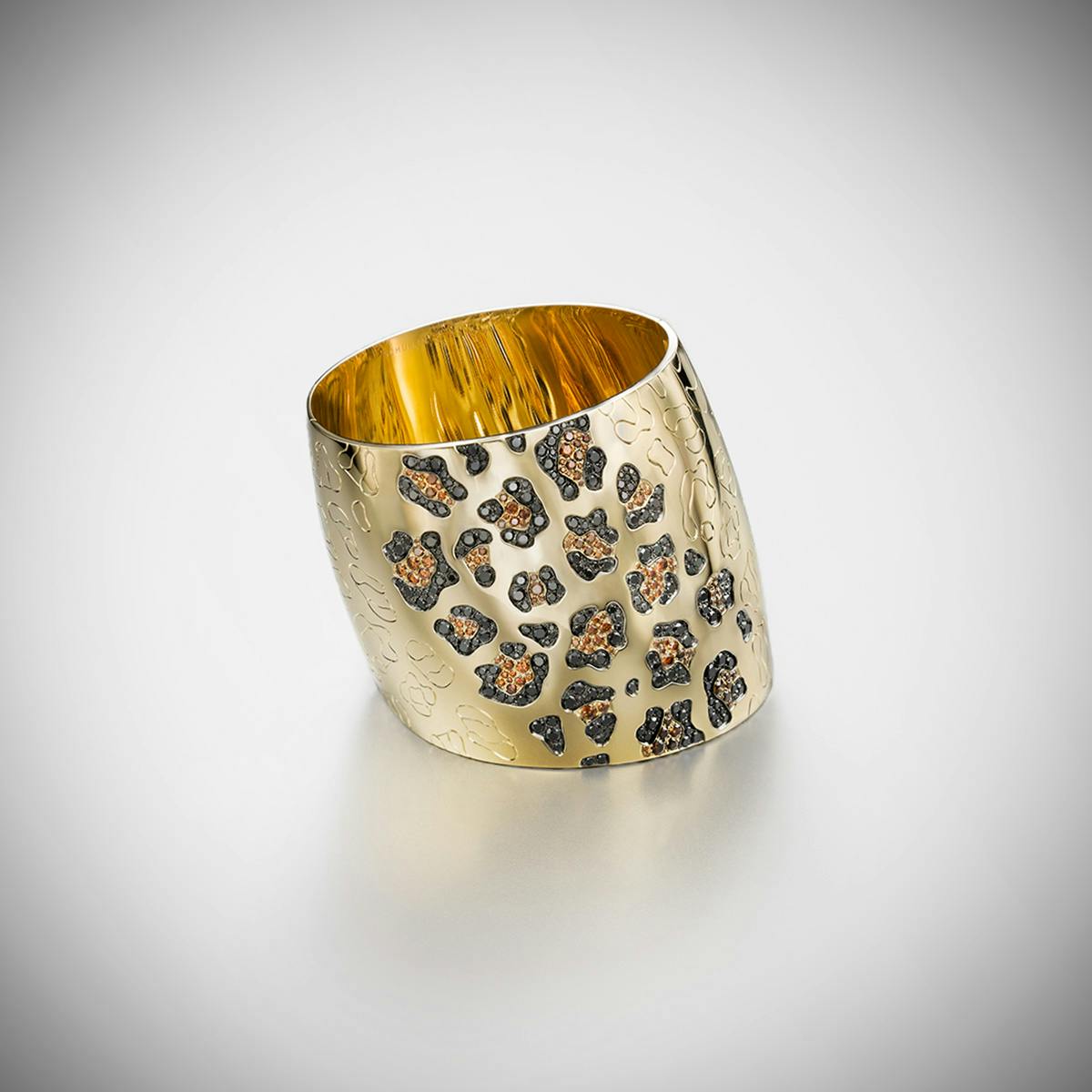 The rosette pattern of a leopard is universally recognized and also ubiquitous in the world of fashion. The “Leo” bangle features a reinterpretation of it using 18k yellow gold for the body, which was carefully and precisely engraved throughout. Colour was added by accurately setting black and brown brilliant-cut diamonds, which makes the resemblance immediately noticeable. The bangle itself has a solid design with a single smooth, curved surface on the interior, as well as the exterior. It also sits at an angle, as to emphasize the pattern and present it in the most desirable way.