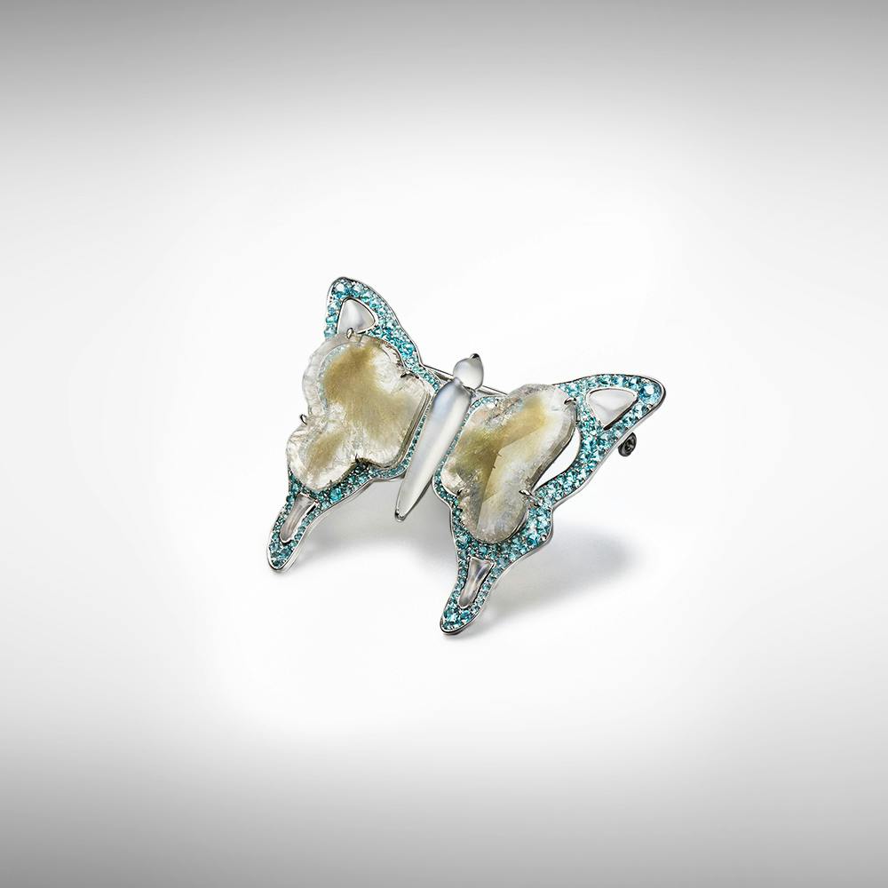 The Schmetterling Brooch, an embodiment of grace and beauty. Crafted with meticulous attention to detail, this brooch is shaped like a delicate butterfly, symbolizing elegance and transformation. Created in 18-carat white gold, the brooch showcases the finest materials and exquisite gemstones. At its center, two mesmerizing grey diamond slices, carefully cut to give a special touch. The butterfly's wings edges are adorned with 216 brilliant-cut Paraiba tourmalines, totaling 2.37 carats. These vibrant gemstones exhibit a breathtaking turquoise hue. Their scintillating sparkle and vivid color create a captivating display of light and movement, enhancing the brooch's look. Completing the design, five cabochon-cut moonstones, totaling 3.61 carats, are delicately positioned along the butterfly's body, adding a touch of ethereal charm. These moonstones, with their enchanting glow and mysterious iridescence, evoke a sense of tranquility and magic.